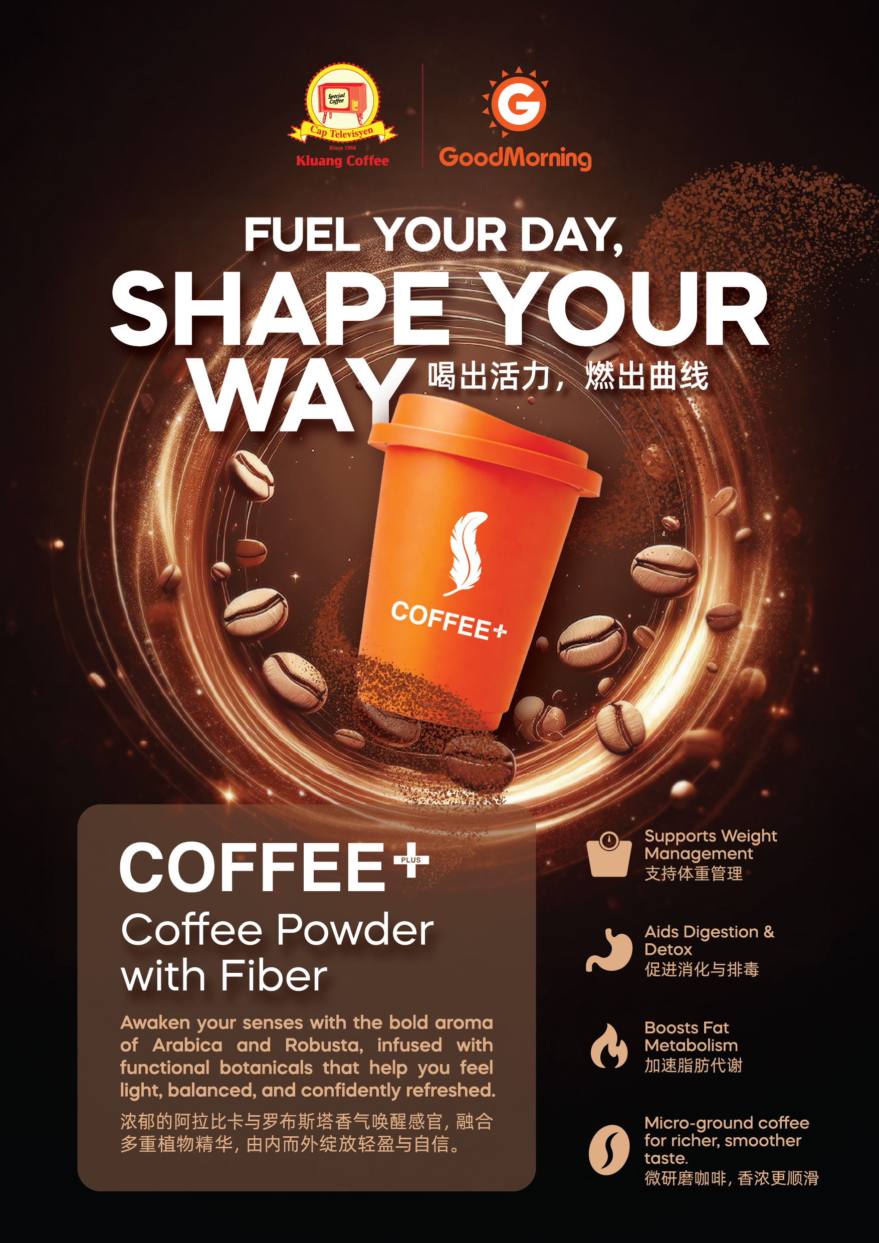 A rich blend of Arabica & Robusta coffee with added fiber, Aloe Vera, and InnoSlim® to support weight management, aids digestion & detox, and boosts fat metabolism. Perfect for health-conscious coffee lovers.